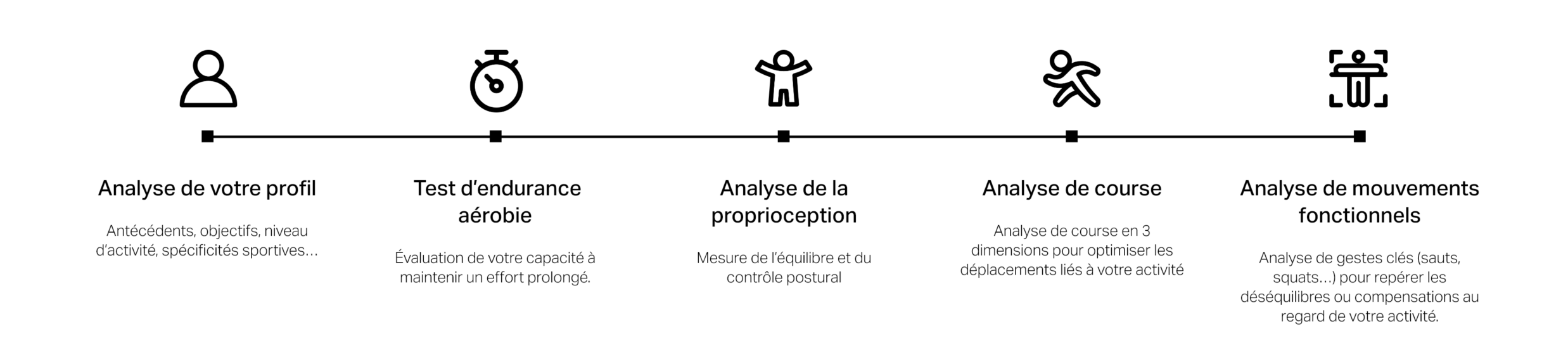 Ce parcours évalue votre force, votre endurance, votre équilibre, votre mobilité, ainsi que vos mouvements clés (sauts, squats) et votre technique de course grâce à une analyse 3D.